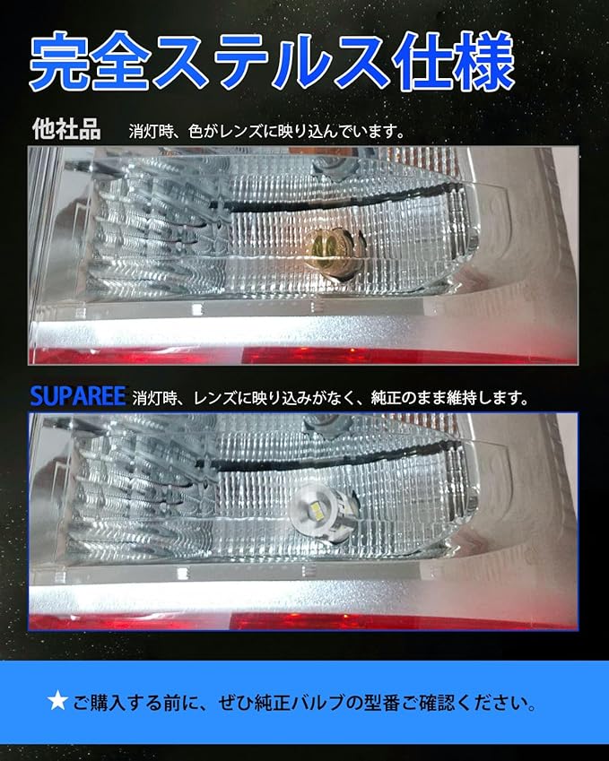 【爆光LEDバルブ&360 全方向照明】SUPAREEのT20 LEDダブルは超高輝度の3020SMDLEDを18個搭載し、360 全方向に光を拡散させることで、均一な明るさを実現しています。超高輝度により、車両後方の照射範囲をより遠く・広くカバー可能。悪天候時でも視認性が高く、後方からの追突事故などを防ぎ、安全性を大幅に向上させます。※本製品は12V専用です