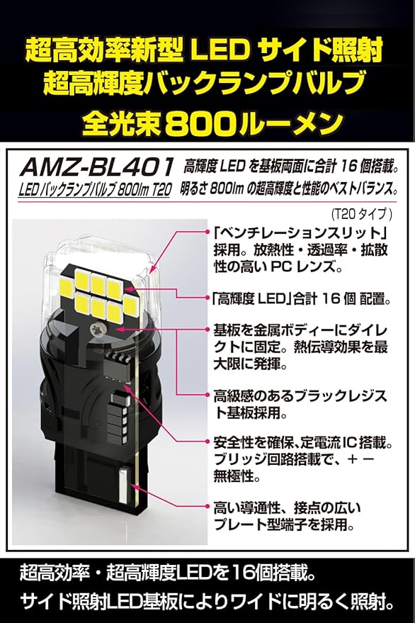 M's Basic by IPF バックランプ LED 車用 T20 800lm 6000K ホワイト 12V用 1本入 車検対応 定電流回路搭載 無極性 高拡散性レンズカット 高輝度LEDチップ採用 AMZ-BL401