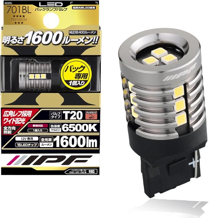IPF バックランプ LED 車用 T20 1600lm 6500K ホワイト 12V用 1個入 車検対応 ノイズ対策済 最新ハイルーメンモデル 超高効率新型LED搭載 定電流回路+保護素子内蔵 701BL