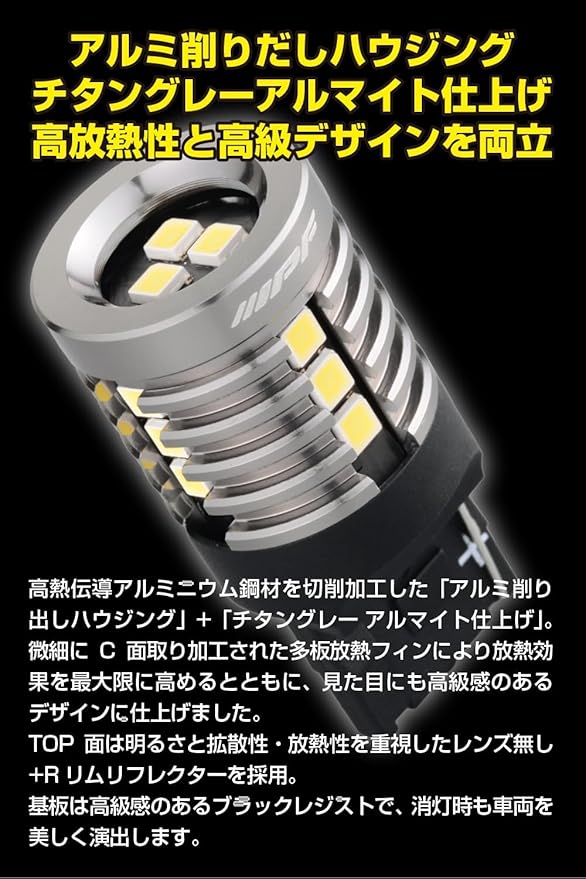1瞬発力のある明るさ重視: 超高効率新型LEDをTOP面3チップ/ SIDE面12チップの15 LEDを使用、電流値UPで圧倒的な明るさ。