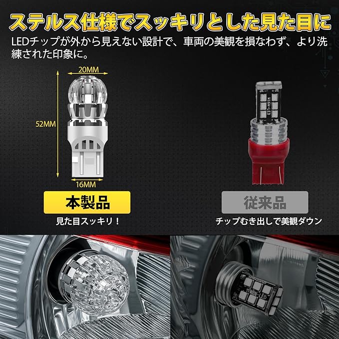 【ステルス仕様&優れた耐久性】高級LEDバルブをお探しですか?Perrace t20 led ダブル ブレーキランプは、高品質な銀色ボディと硬い保護カバーを採用し、LEDチップを外部の汚れや衝撃からしっかり守ります。LEDチップは外に露出せず、車両の美観を損なうことなく、より洗練された印象を与えます。さらに、99%透過率で、光がクリアで均一、360 全方向に豊かな光を提供し、高輝度と長寿命を実現!耐熱温度180℃を誇り、過酷な環境でも安定した性能を発揮し、長期間の使用にも耐える優れた耐久性を備えています。