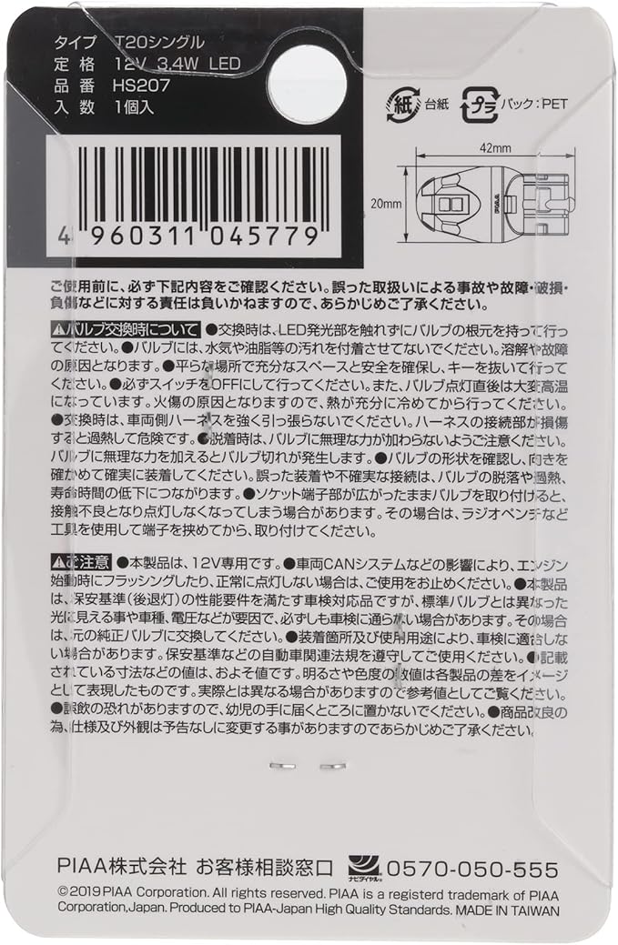 PIAA バックランプ/コーナリングランプ用 LED 6500K 12V 3.4W 310lm T20シングル ECO-Lineシリーズ 車検対応 1個入 HS207