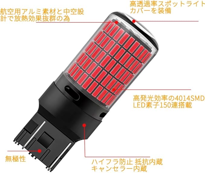 「昇級版・爆光モデル・150連4014SMD」Aokyoung T20 LED ダブル レッド テールランプ ブレーキランプ 赤色 7443 W21/5W 12V対応 バルブ ブレーキ球 ストップランプ 警告灯点灯防止 キャンセラー 抵抗内蔵 無極性 高輝度 4014SMD 150連 超拡散レンズ付き 2個入り