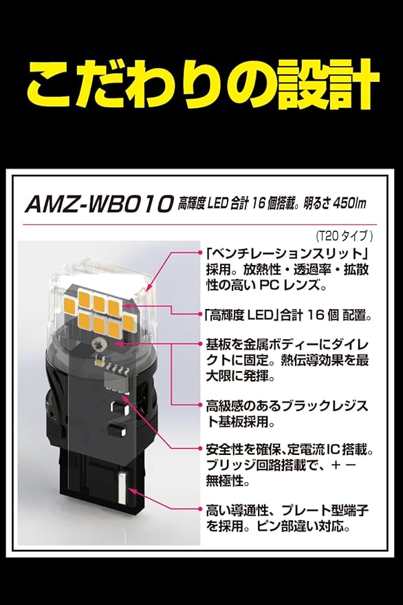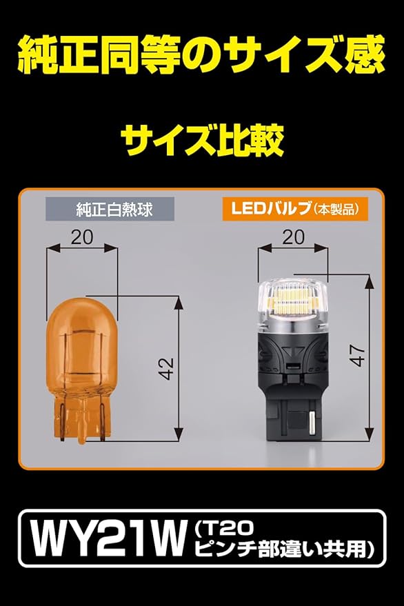 仕様:LED T20シングル(ピンチ部違い対応)12v-5.3w、アンバー/クリアレンズ対応(WY21W/W21W)、明るさ:450lm