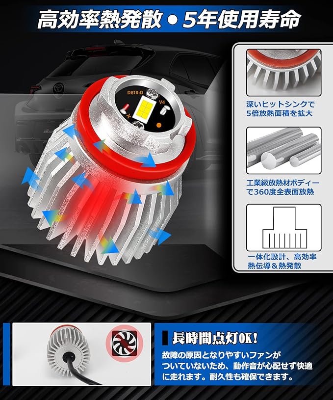 ■季節を問わず安定する点灯:IP68防水耐熱、-40℃~105℃正常動作、真夏の夜道から吹雪が続いている北海道の雪道まで、いつでも安全を確保できます。■高効率放熱で長寿命:純正より5倍放熱面積を拡大する深いヒットシンク+過熱保護回路が搭載します。純正より発熱量を20度(約)を下がる、高温によるチップの劣化を効率的に防止するため30000時間使用寿命を確保できます。