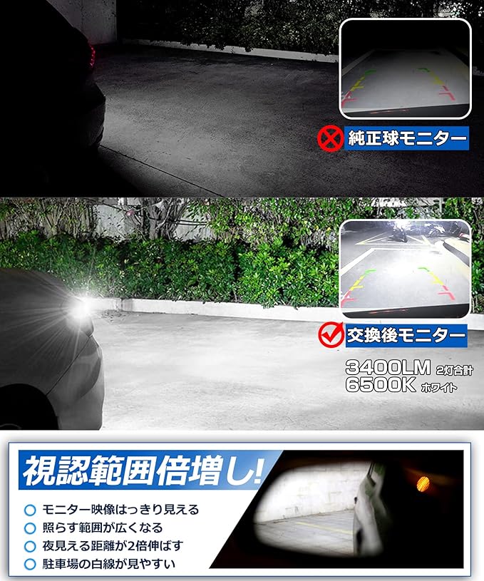 ■車検対応最強発光3400lm(2灯):安定する時も純正より4倍の光量アップ。純正品より照らす範囲を倍増し、かつて照明の死角だった区域も明るく照らして、後方の障害物をはっきり見えます。 ■後方確認しやすい均一に配光:直視できないぐらい爆光バルブより、SINMAIT LEDバックライトは視認性を重視され、夜でも駐車場の白線がはっきり見えるのを追求します。バックモニターから夜見える距離が倍増しくらいになって、車庫入れも少し楽に感じます。