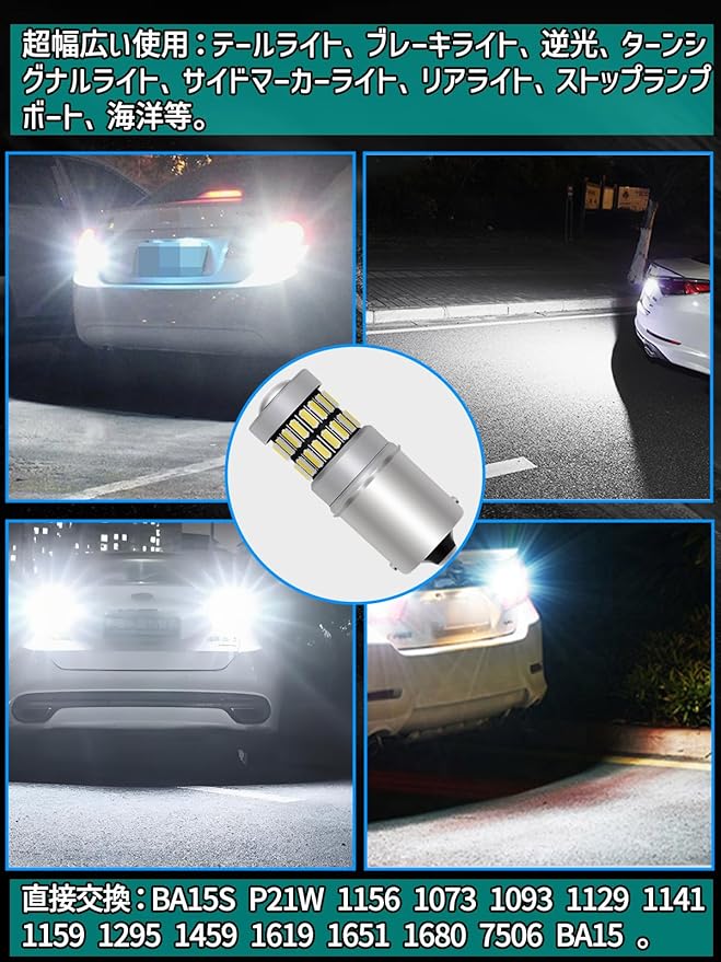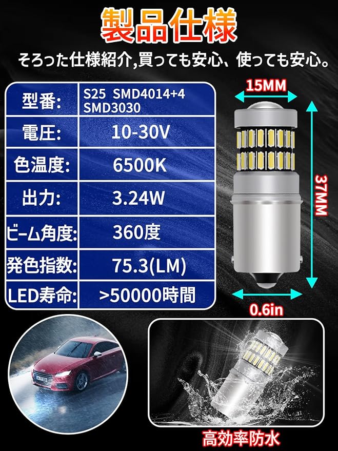 【商品スペック】用途: バックランプ、ターンシグナルライト、リバースライト、ブレーキライト、テールライト、リアライト、インジケータライト、ストップランプ、コーナリングランプ、駐車ライト、サイドマーカーライトなどの置き換え。 型番:S25 シングル ピン角180度 / LED素子:3030SMD 4個 4040SMD 32個 / カラー:ホワイト 6500k*2個 / 極性:無極性 / 電圧:DC12-24V / セット数:2個。