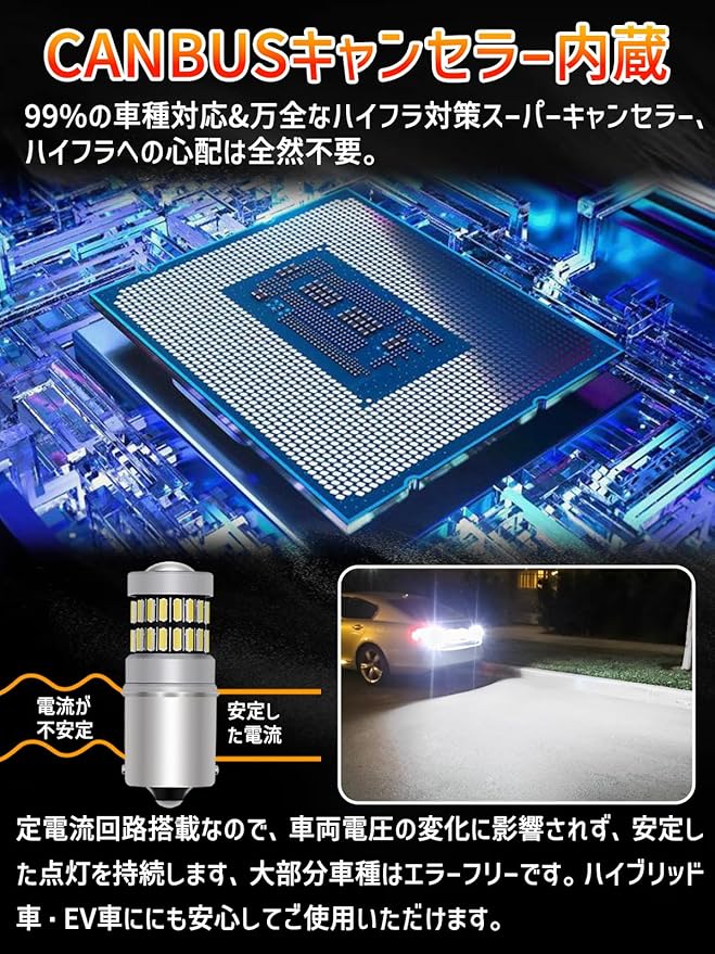 【無極性&定温電流】CANBUSキャンセラー内蔵で、フリッカーエラーもなく、99%の車種対応&万全の車酔い対策でスーパー解消、車酔いの心配もありません。定電流回路を搭載しているため、車両の電圧変化の影響を受けず、安定した照明を持続し、ほとんどの車種で誤射がありません。ハイブリッド車、EV車でも気軽に利用でき。