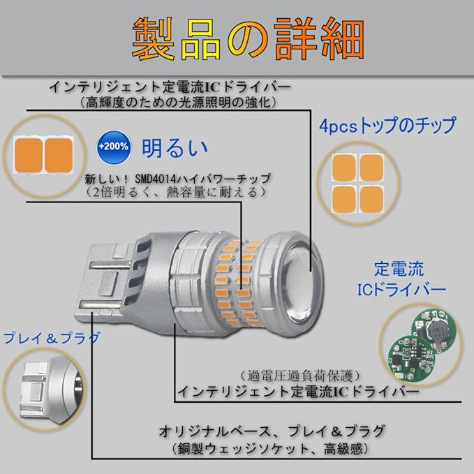 7443 WY21W T20 LEDダブル ウィンカー バルブ ハイパー防止点滅なし 12V-24V キャンセラー内蔵 ステルス車検対応、アンバー 爆光、 2個入り