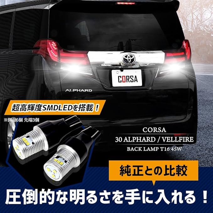 CORSA アルファード ヴェルファイア 30系 適合 LED バックランプ T16 45W 2個1セット バックライト 無極性 6500K ALPHARD VELLFIRE カスタム パーツ アクセサリー ドレスアップ [2] M