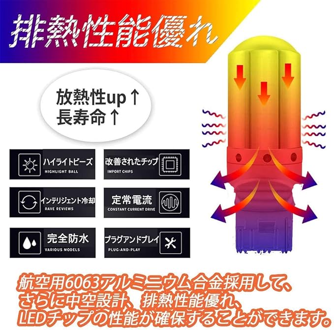 【アルミヒートシンクを採用】耐久性・耐熱性に優れたアルミヒートシンクを採用し、放熱効率を最大限に引き出すことに成功しました。長時間の使用にも耐え、安定した発光が可能です。バルブLEDチップと抵抗から発生する熱を効率良く逃し、寿命を伸ばします。