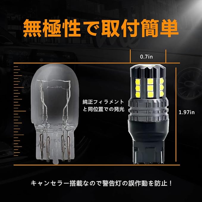 【国際ソケット】:T20 W21W 7443 7440 7441 7444 992 WY21Wなどにフィット。取り付けが簡単、プラグ&プレイが簡単。電球が点灯しない場合は180度反転してください。ご注意:※全ての車種において動作保証はできません。一部の車種ではキャンセラーが機能しないです。