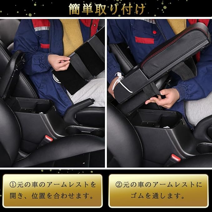 ②簡単な設置で、高級感あふれるレザー製アームレスト。腕にフィットし、車内のドレスアップに最適。 工具や穴あけ不要。