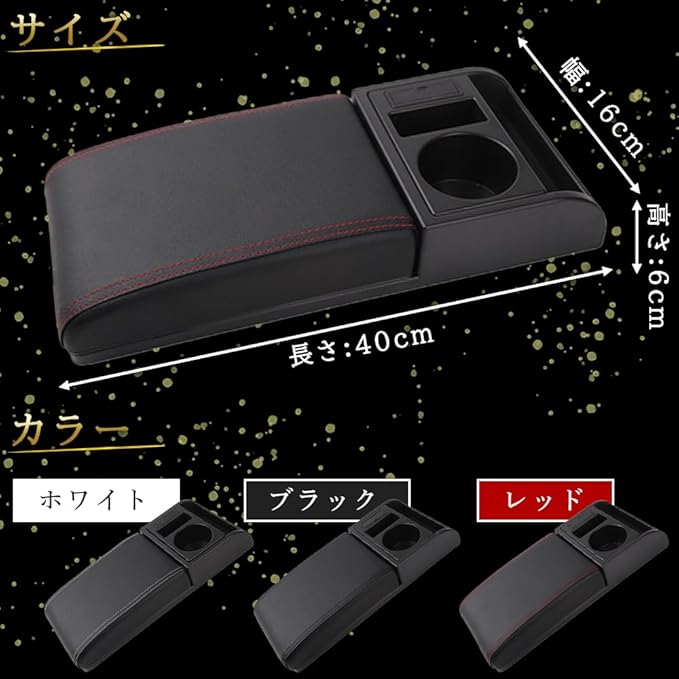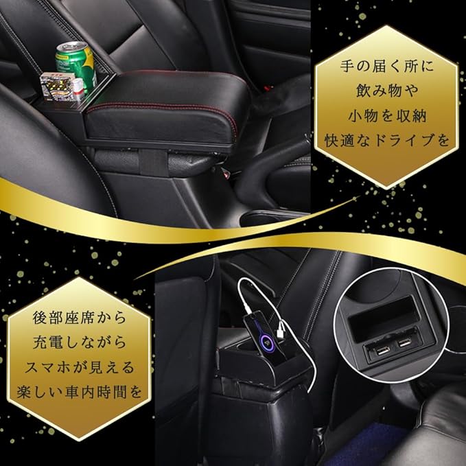 ①ドライブを快適にする車用汎用アームレスト。 ドリンクホルダーとUSB充電ポート付きで、インテリアをオシャレにカスタム。 コンソールボックスに簡単装着可能。
