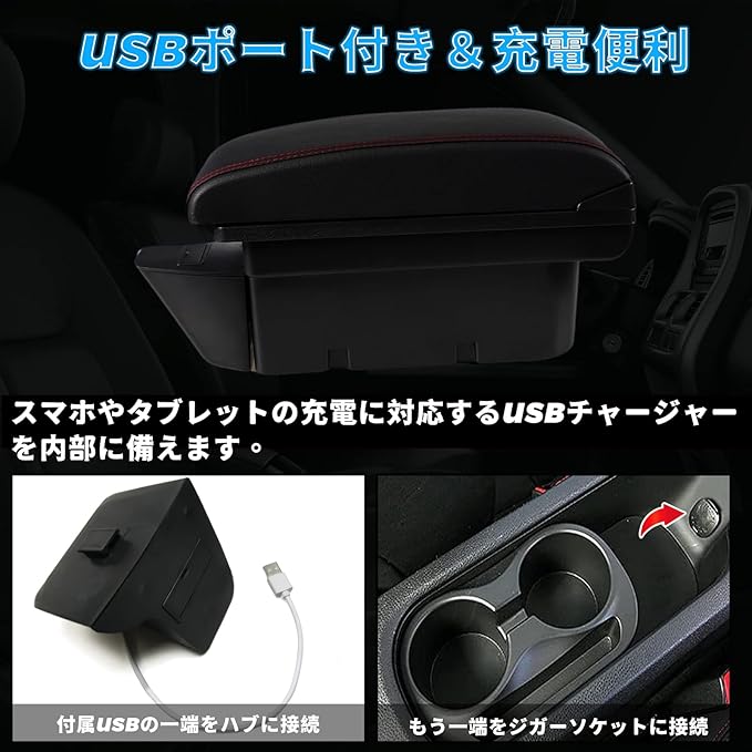 【機能性アップ】本コンソールボックスには、リッド(カバーぶた)がアームレストを兼用しているタイプです。リッドを開けば、収納スペースとして活用できます。スマホやタブレットの充電に対応するUSBチャージャーを内部に備えます。