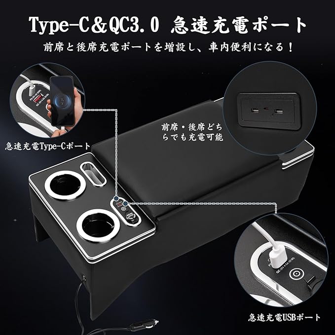 3.【急速充電&LEDライト搭載】: フロントに急速充電のType-CとQC3.0USBポートが1個増設され、スマートフォン・タブレットなどを急速充電できます。また、後部も急速充電のType-C 1個とUSBポート2個を改良し、後部座席の乗客にも便利になります。コンソール部分は雰囲気ブルー色ライト付きますので、見た目も良く、高級感もアップし、車内も煌びやかに演出します。