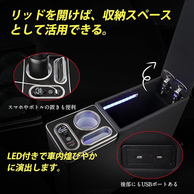 【収納力アップ】本コンソールボックスには、リッド(カバーぶた)がアームレストを兼用しているタイプです。リッドを開けば、貴重な収納スペースとして活用できます。車内の機能性が大幅にアップする優れセンターコンソールです。※:走行時の振動などで蓋が閉まって挟まれる可能性があるので、コンソールボックスを開けたままにしないよう注意ください。