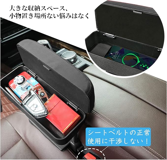 特徴、製品の性質:弊品はアームレストとコンソールボックスとカップホルダーの完璧なコンビネーション、省スペース、シートベルトに干渉しなく、便利な小物入れ(スマホ、鍵、ウォッチ、マスク、ポケットティッシュやフリスクなど)、高級感あふれ、サイズがピッタリ、運転中ビビリ音なく、長持ち、見た目良し、インテリアと調和するスマートなデザイン、無毒無臭