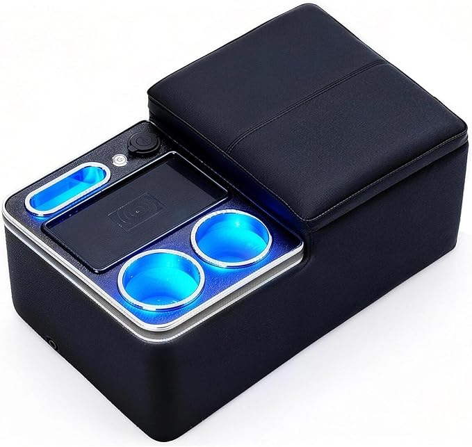 【夜のドライブに快適さを】上面プレートにはLED照明を内蔵。暗闇でも荷物の位置が一目でわかり、コンソールからの出し入れも簡単です。