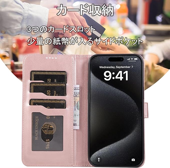 【カード収納】このケースは収納機能を備え、名刺、クレジットカード、交通カード用の3つのカードスロットを搭載。透明ポケットには大切な写真を収納でき、内蔵の小ポケットで小銭も整理可能。この財布型スマホケースは、ちょっとした買い物や散歩に、が気軽に出かけられます。