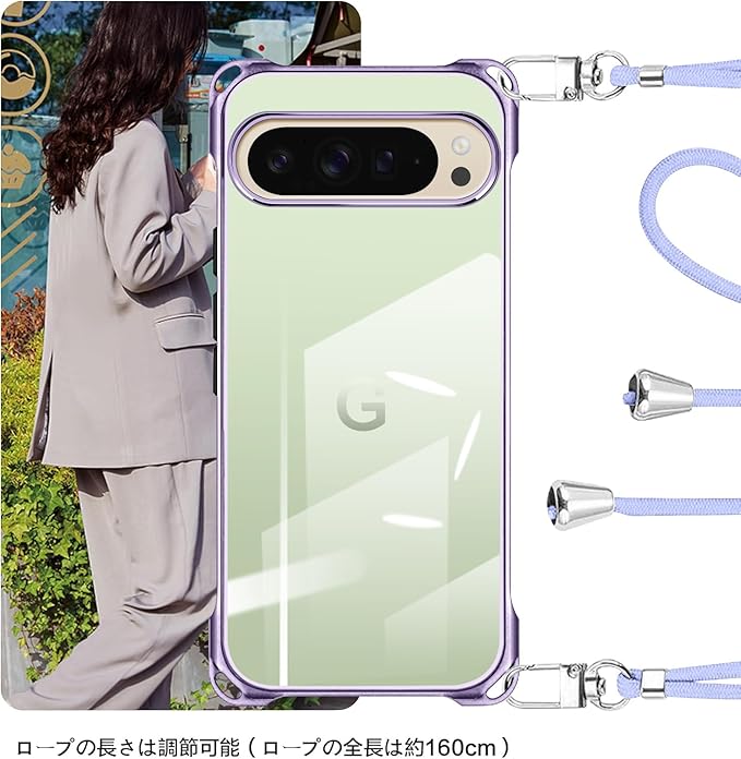 For Google Pixel 10 Pro XL 用 ケース クリア ショルダー 10Pro XL 携帯カバー 耐衝撃 全面保護 スマホケース ストラップ付き 肩掛け 斜めかけ 縄掛けケース TPU 薄型 軽量 取り外し可能 落下防止 柔軟【パープル】