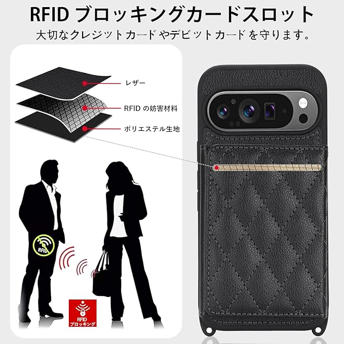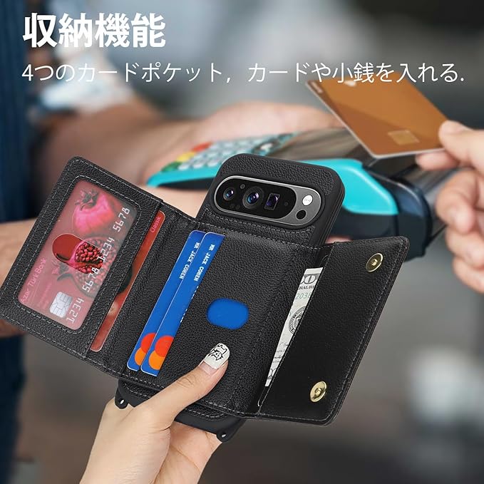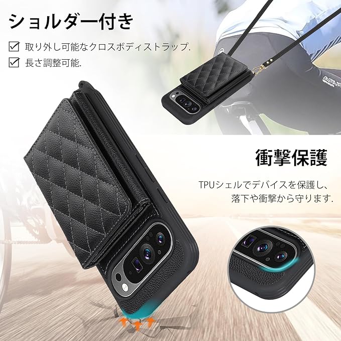 対応 Google Pixel 10 ケース ショルダー グーグルピクセル10 ケース カード収納 鏡 肩掛け 斜めかけ スマホショルダー ピクセル10 Pro ストラップ付き 耐衝撃 調節可能な 携帯ケース pixel 10 Pro - ブラック