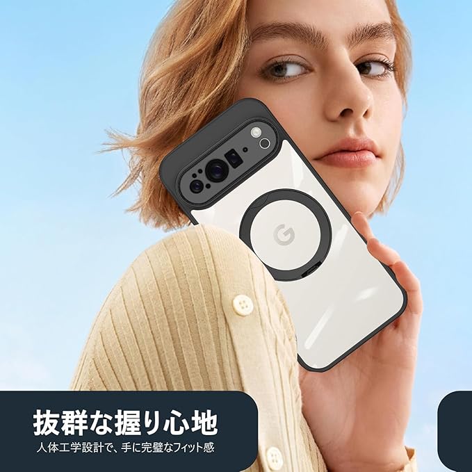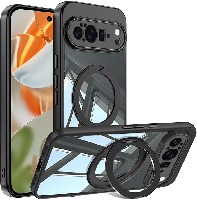 Google Pixel 10 Pro XL 用 ケース クリア カバー 360 回転スタンド 磁気対応 マグネット搭載 透明 リング マグネット ワイヤレス充電対応 スタンド機能 ピクセル 10pro xl 保護ケース 角度調整 滑り防止(ブラック)