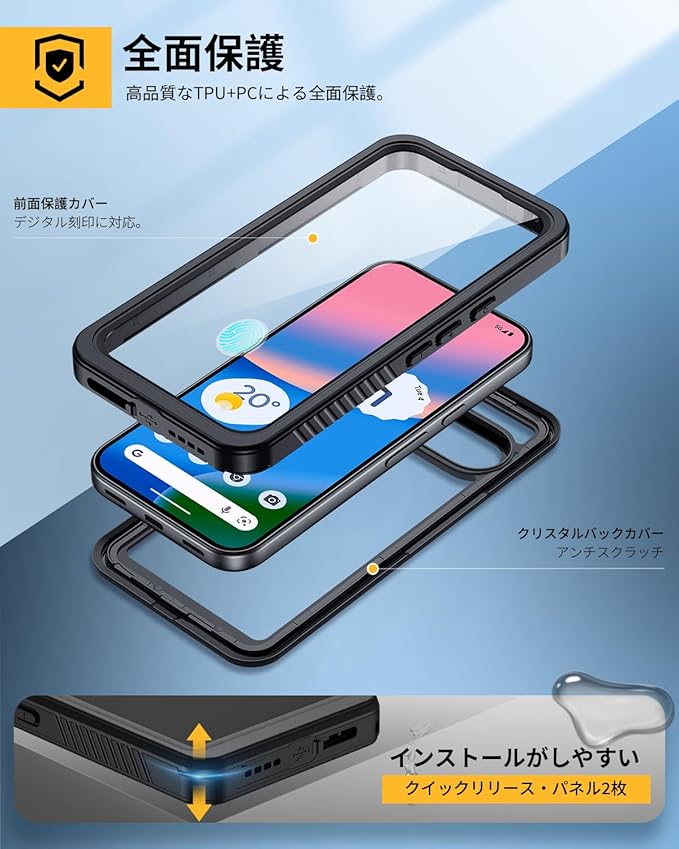 【簡単に装着・脱着】斬新な設計による簡単装着・脱着。高級感を損なわない一体感を実現、前面フレームと背面プレート分離した設計。薄型&軽量:ピクセル 10 防水ケースを入れたまま、手持ちが良く、長く持っても手が疲れる感じもありません。握った感じも滑ることはなく、しっかり手に馴染みます。