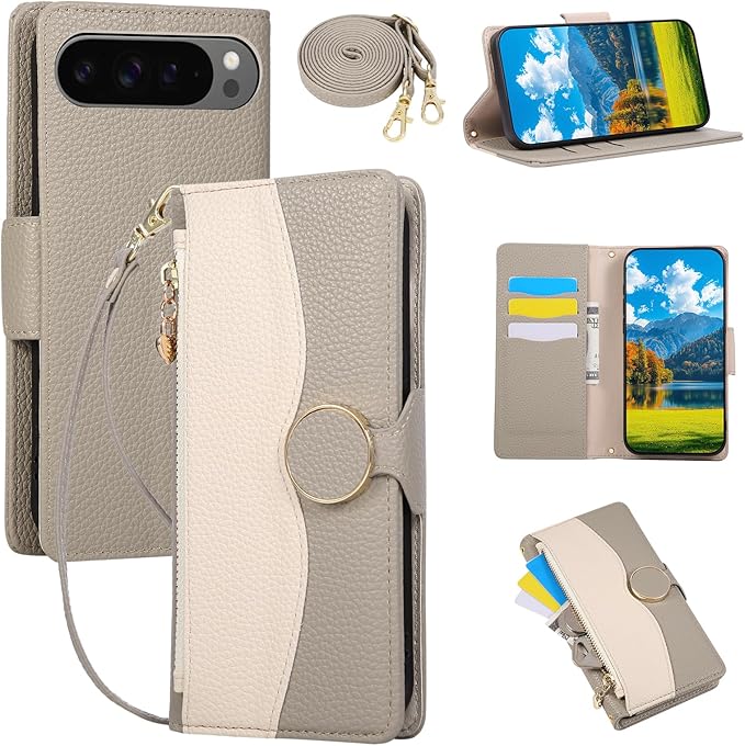 用の グーグル ピクセル10プロ ケース 手帳型 For Google Pixel 9 Pro スマホケース ショルダー ピクセル10 用 ケース手帳型 Pixel10Pro 携帯カバー Google Pixel 9 手帳型ケース 小銭入れ マグネット式 カード収納 スタンド機能 全面保護 ファスナー型 手首/肩掛けストラップ付 2色パッチワーク おしゃれ 人気 (グレー)