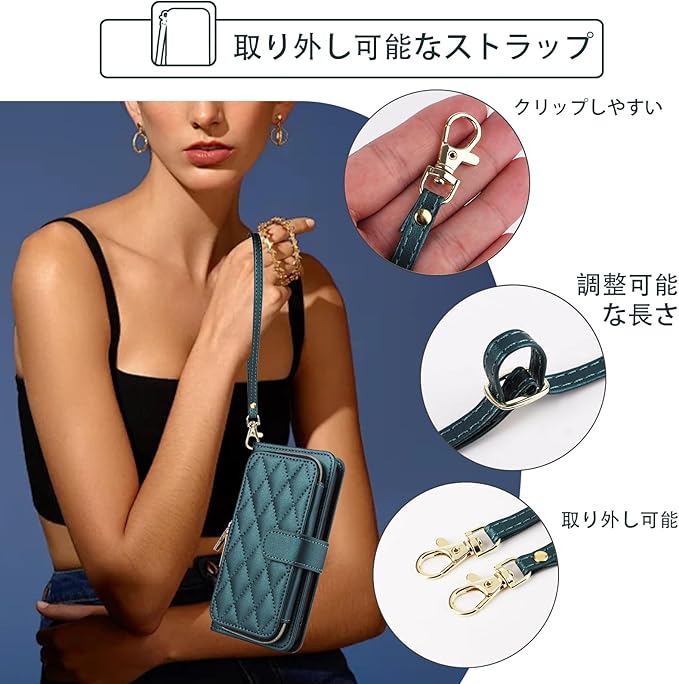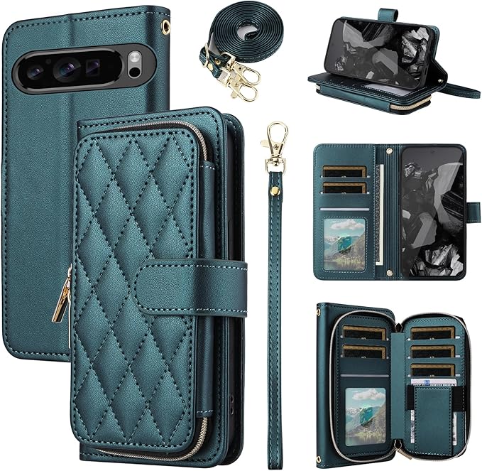 Elisorli for Google Pixel 9 Pro XL/10 Pro XL 手首/ショルダーストラップ カードスロット ジッパー財布 スタンド ための 携帯電話のカバー 持つ Pixel9 9Pro Nine Pixel10 10Pro LX ウォレットケース しい ケース スマホケース カバー スマートフォン 耐久性 耐衝撃 フラップ ストラップホール カード収納 女 グリーン