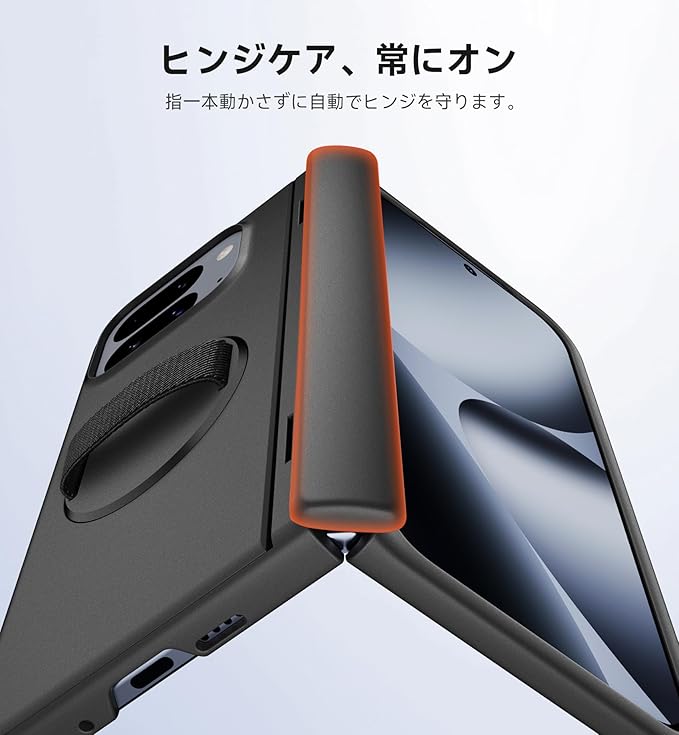 自動ヒンジ保護:折りたたんですぐに使えます!デバイスを閉じると、耐久性のあるヒンジカバーが自動的にロックされ、完全な保護を実現します。余計な操作や思考は一切不要。あなたのスピードに合わせてシームレスに保護します。