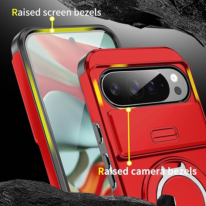 Pixel10 Pro XL 対応 ケース 【横縦両立・多機能360度回転スタンド】 リング 耐衝撃 薄型 TPU+PC 車載ホルダー レンズ保護 フィット感 防指紋 おしゃれ ストラップホール付き 落下防止 防塵 グーグル ピクセル10 プロ XL 対応 カバー 6.8インチ レッド JMJP15-3