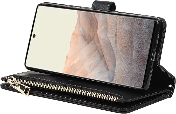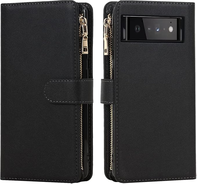 Eastwave for Google Pixel 6 Pro ケース for pixel 6pro 縄掛けケース 手帳型 財布型 ICカード コインポケット ストラップ付き カード 収納 小銭入れ ファスナーポケット付き PUレザー 6色ブラック
