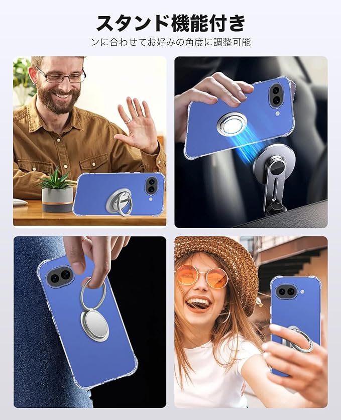【精密設計】リング内側部分にメタルプレートを採用、マグネット式車載スマホマウントホルダー に対応で、直接吸着させることができます。ケースを横置きにするとスタンド機能になり、持たず動画鑑賞などを楽しむことができます。