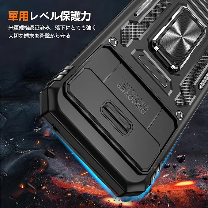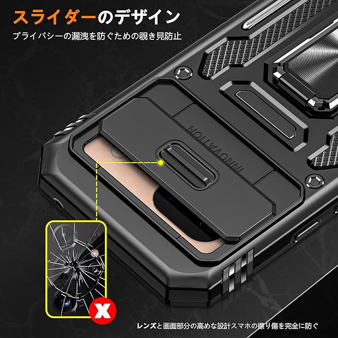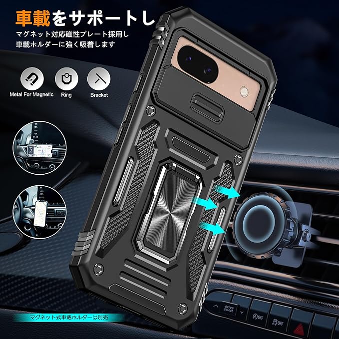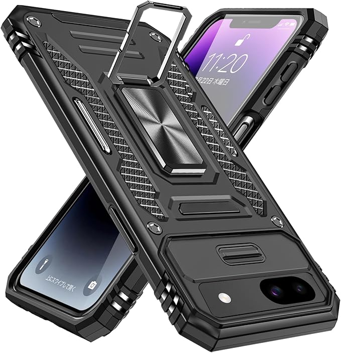 対応 Pixel 8A 用のケース リング付き スライド式カメラカバー 衝撃吸収 対応 ピクセル 8a 用のケース 耐衝撃 一体型落下防止 米国軍事MIL標準取得 スタンド機能 PC+TPU 二重構造 防塵 薄型 軽量 360度回転 全面保護携帯カバー (黒)MJJ-1064-03-01