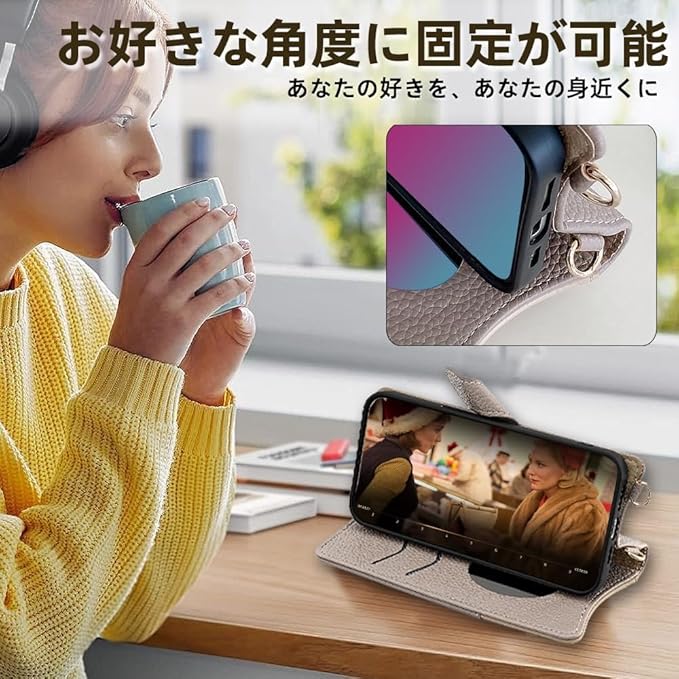 快適な持ち心地と使いやすさ: 付属クロスボディチェーン、全長120 cm。金具の装飾が美しさと上品さを漂わせてます。斜めがけ、肩掛け、通勤、旅行、犬の散歩、山登り、海へ行く、買い物、外食、重い荷物を持っている時、子供を連れて外出する時もスマホを紛失すること心配なく両手が解放されます。また、マグネット式の留め具により、片手で簡単に開閉ができ、スタンド機能も兼ね備えています。