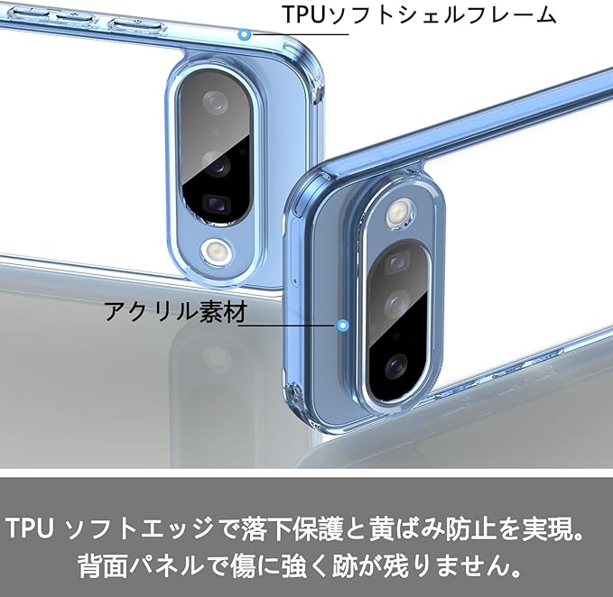 【航空級素材】特殊な黄変防止素材を採用し、紫外線や汗に強い透明性を保ちます。アクリル製バックパネルは傷に強く、長く使ってもくもりません。表面に特殊なコーティングを施し、指紋や汚れが付着しにくくなっています。柔らかい TPU バンパーは滑りにくく、持ちやすい形状で日常使用に最適。