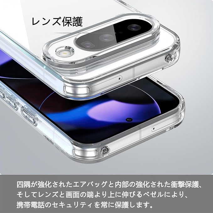 【包括的な保護】四隅にエアクッション構造を搭載し、落下や衝撃から本体を守ります。レンズと画面部分を 0.3mm 高く設計し、擦れや傷つきを防止。