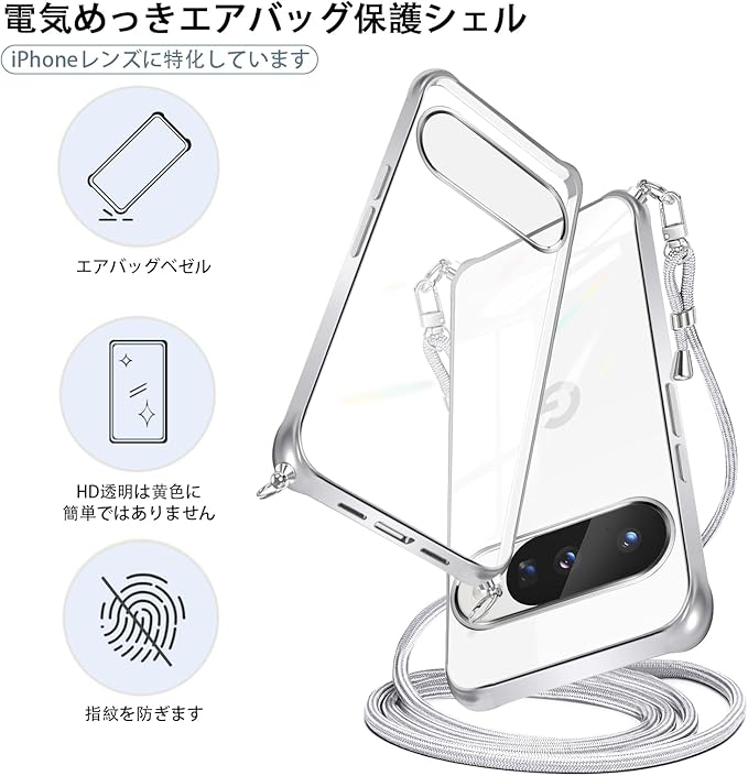 Google Pixel 10/10 Pro ケース 薄型カ 肩ひも ネックバンド 長さ調整可能 斜め掛け可能 TPU 耐衝撃 ピクセル10 インテリジェントシェル 傷つけ防止 衝撃吸収 ピクセル10 pro シリコンケース 軽量 薄い カメラレンズ保護 pixel10 落下防止 柔軟 黄変防止 カバー 米軍MIL規格 (シルバー)
