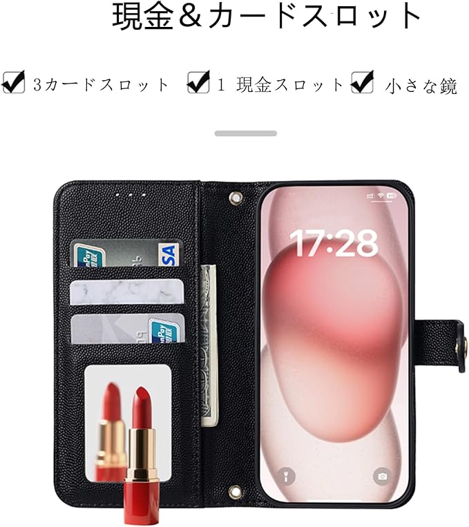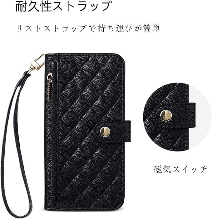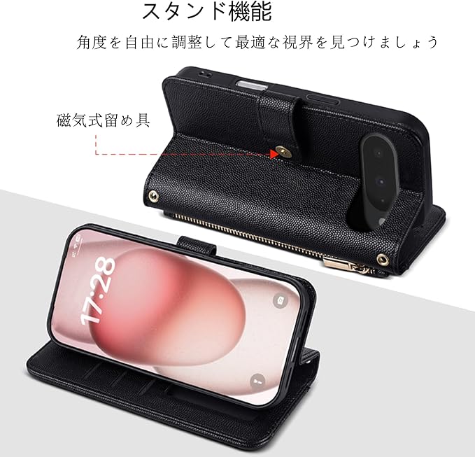 【外観と配色】:Google pixel 9 pro ケース には、リストストラップと斜めのショルダーストラップが付属しています。スマホをしっかりホールドでき、落としにくい。また、ショルダーストラップを斜め掛けにすることで、外出時に両手が空くので便利です。必要に応じて適切な長さを選ぶことができます。携帯ケースの表面には、手触りも質感も心のこもった刺繍加工が施されています。高級感のあるゴールドのメタルジッパーが、一味違ったファッションを演出します。また、豊富なカラーバリエーションで様々な選択肢に対応できます。