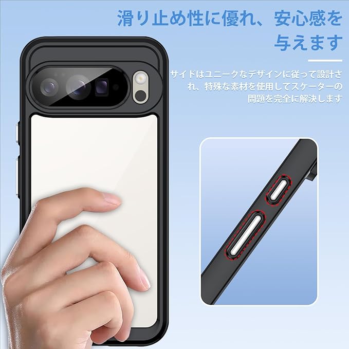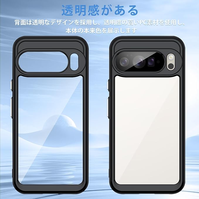 「黄ばみ防止」ケースの側面は単色のTPU素材で作られており、耐久性があり、色が変化したり変形したりしにくいです。背面パネルは、酸化防止加工を施した透明PC素材を採用。黄ばみを防ぎ、長期間使用しても透明感を保ちます。表面には疎油性コーティングが施されており、指紋や油汚れ、汗染みがつきにくく、爽やかな手触りです。