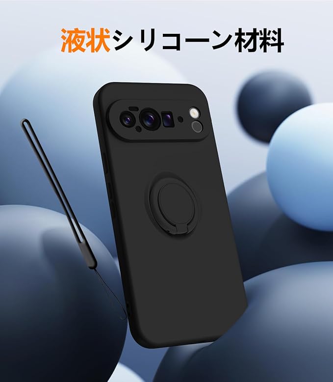 対応 Google Pixel 10 Pro XL 用 ケース リング ストラップ付き ストラップホール付き ソフト シリコン おしゃれ 耐衝撃 軽量 薄型 スタンド機能 車載ホルダー対応 ピクセル 10 プロ XL 携帯カバー 黒 R-YTDS-GP10PXL-01