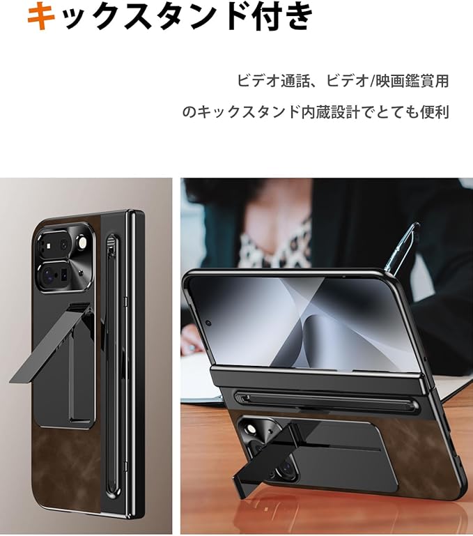 NINKI コンパチブル Google Pixel 10 Pro Fold 交換用ケース タッチペン付き ペンスロット ヒンジ保護 キックスタンド内蔵 折り畳み式 PC+レザー製 スクリーンフィルム一体型 スタンド機能 スクラッチ防止 グーグル ピクセル 10プロ フォールド 5G 用カバー(ダークブラウン)