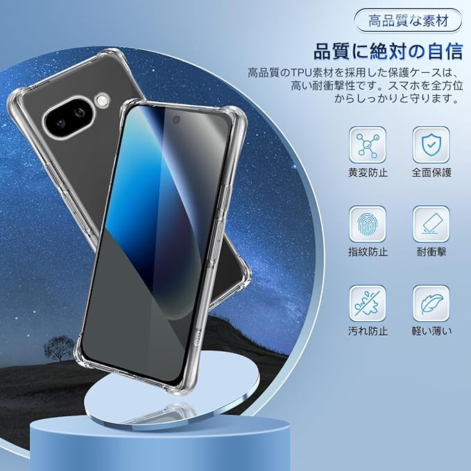 【黄変防止強化材質 驚くほどの透明度】ドイツ製 TPU 素材(バイエルン産)を採用しており、TPU に UV 剤を添加することで、黄変防止性能が JIS 規格 4.5 級に達しています。スマホを長時間使用しても、光沢感を維持できます!背面の光透過率は 99% に達し、透き通った高い透明度を誇ります。対応 ピクセル10a 本来のデザイン美を損なわず、洗練された外観を引き立てます。