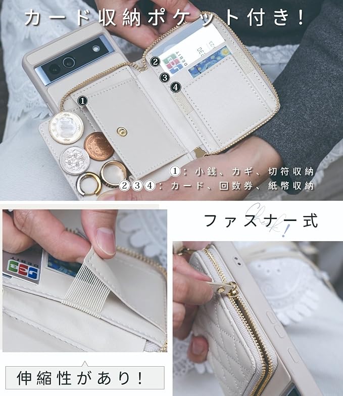 【背面手帳型 ショルダー ケース・スタンド機能】 スッキリした背面手帳型 スマホケース。携帯の表はおおわず、カード 収納は裏面に。スマホの画面にすぐタッチ。使うたびに開くわずらわしさがない! フリップ部分にしっかり厚みがあるので、開いて立てるとスマホスタンドとして使える。かんたんにスマホを支えて、映像やビデオ通話などに楽しめることができる。使わない時はスマートに収めるから邪魔にならない。( tip:ファスナー位置の調整によりスタンドの安定性を高める)スマホケース ピクセル ケース