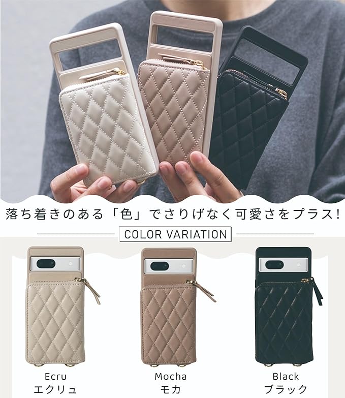 【おしゃれ googleピクセル ケース】 高品質PUレザーを採用し。キルティン製法により、ひし形のチェック柄を作って、しなやかで柔らかいタッチ感とふんわり弾力感が共存。 エレガントなゴールデントーン金具使用。リングやファスナーがキラキラと輝いて、おしゃれなアクセサリー感覚でお手元のスマホケースを彩る。 全3色展開。落ち着いた色味ながら、お洋服にも合わせやすい。ご自身用はもちろん、お友達のお誕生日プレゼント、母の日のギフトなどにもおすすめ。