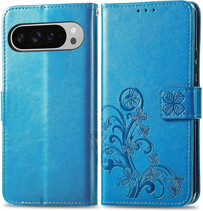 に適用するGoogle Pixel 10 Pro XL ケース 手帳型 ノートブック型携帯電話保護カバー多機能ホルスター財布ホルダーバンプパターンテクスチャ耐久性摩擦耐性ケース男性と女性に適した (四つ葉のクローバーブルー)