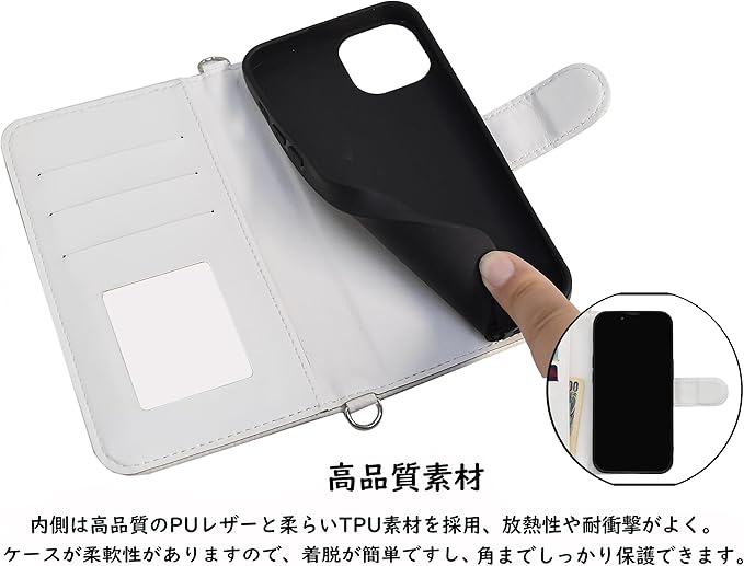 【機能】カードポケット&サイドポケット付き、カード3枚、サイドポケットには少し大きめの紙類が収納できます。機種に合わせてカメラ穴や指紋認証の穴をあけています。カメラホールは樹脂コーティングされ、美しく仕上げに。専用のブラック色柔らかいTPUケース付き。装着が簡単。上下にストラップホールの代わりにDカン付き。