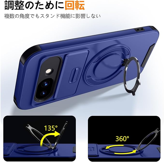 対応 Google Pixel 10A 用の ケース リング付き スライド式カメラカバー 隠しスタンド 耐衝撃 スタンド機能 縦横両対応 車載ホルダー PC TPUバンパー 防塵 人気 落下防止 滑り止め 指紋防止 ピクセル 10a 用のカバー 青 MJJ-1065-19-02