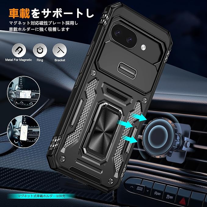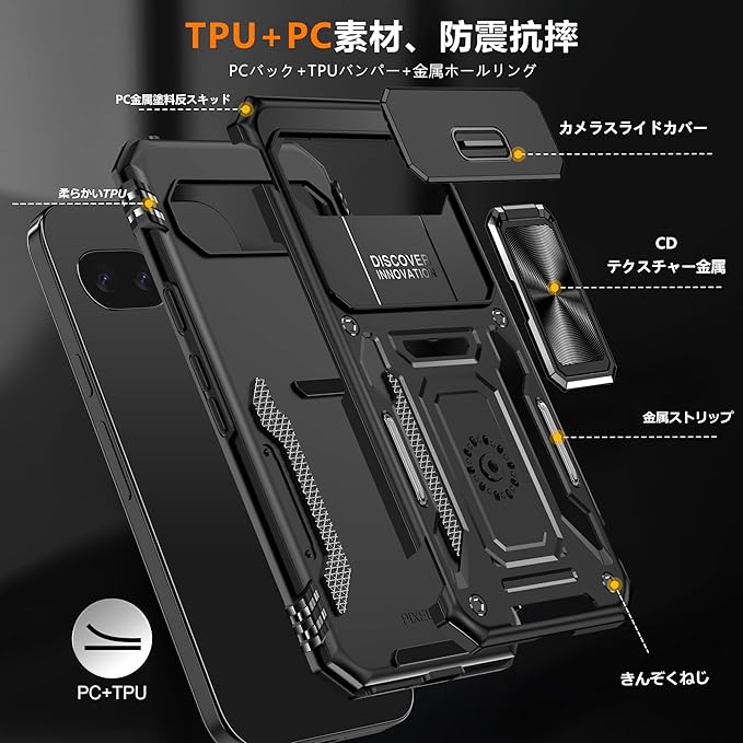 対応 Google Pixel 10A 用ケース リング付き スライド式カメラカバー 衝撃吸収 耐衝撃 一体型落下防止 スタンド機能 PC+TPU 二重構造 防塵 薄型 軽量 360度回転 ピクセル 10a 用の携帯カバー 黒 MJJ-1064-14-01